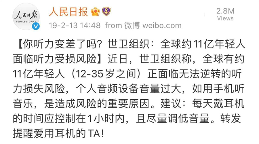世界卫生组织(WHO)发布过一组数据:目前全球约有 11 亿年轻人因个人音频设备音量过大而面临不可逆的听力损失。将近一半青少年用耳机听音乐时音量过高,而这种高音超过15分钟,就会对听力造成伤害。世卫组织提醒,一旦丧失听力,再也无法恢复。